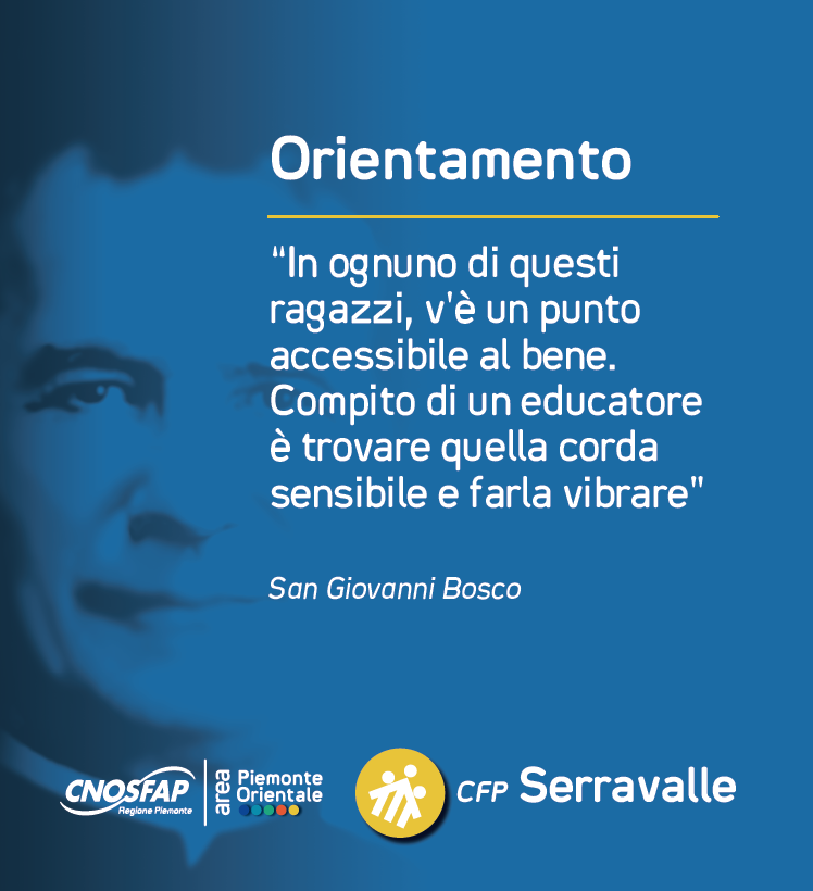 Per informazioni e appuntamenti, contattare i nostri orientatori al numero 0143 686465 (Referente Orientamento dott.ssa Stefania Bigotto) o con e-mail all’indirizzo orientamento.serravalle@cnosfap.net